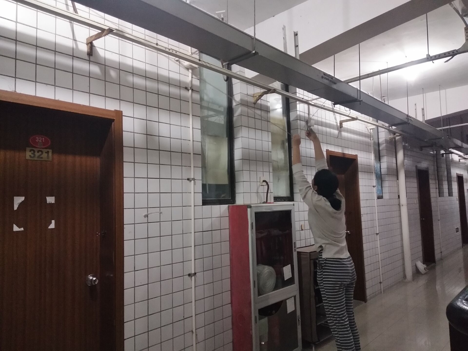 为了营造安全和谐的住宿环境,11月5日晚上9点半,七号楼辅导员带领楼委会成员,带着笔和本子,对七号楼楼道的消防设施进行逐一检查,详细记录了每一层楼道走廊灯和每一间宿舍门前的安全指示灯以及消费器材是否损坏。同时,清理了楼道堆放杂物,向每一间宿舍学生说明保障消费通道畅通的意义,要求学生遵守宿舍管理规定。同学们积极配合,立即进行整理,拆除走廊晾衣绳。经过整理,七号楼楼道明显整洁多了,同学们的安全得到进一步保障。