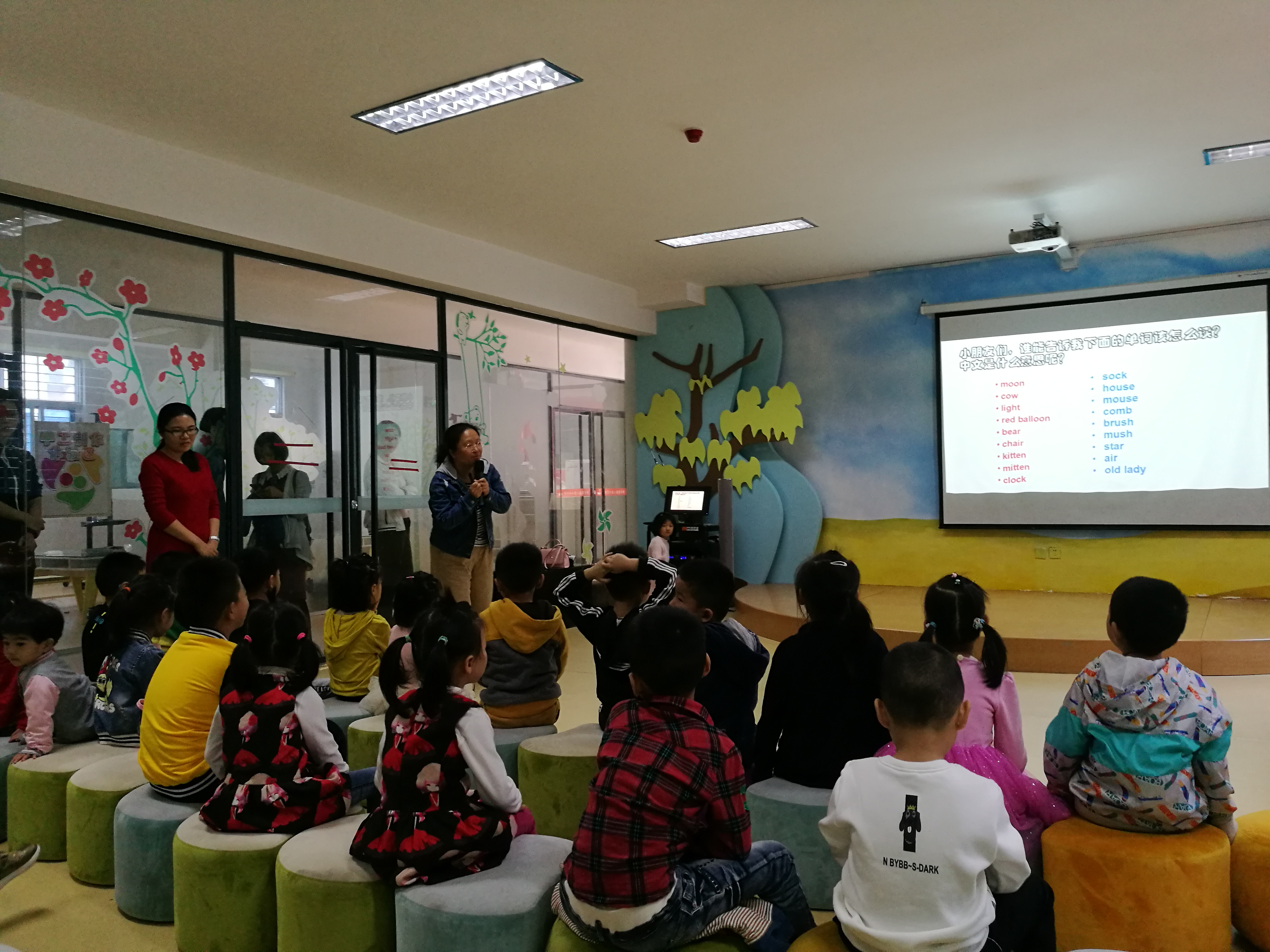 黄秋平老师讲解现场 本次绘本讲读包含中文和英文两部分,绘本内容符合了4-7岁小朋友的接受范围,吸引了近二十位小朋友前来参加。中文绘本主题为《小动物过冬》,由黄秋平老师进行讲读,她用生动的绘本故事,让小朋友们明白了动物冬眠的科学道理;英文绘本题为 《Goodnight Moon》,该部分则由肖婵婵老师进行讲读,通过如诗歌一般琅琅上口的绘本内容,让孩子们学习了一些生活用品的重点词汇,并邀请小朋友上台展示、朗读英文单词并翻译,调动其学习热情。