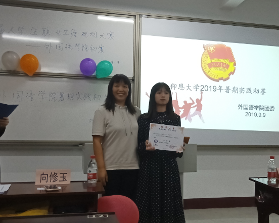 获奖学生与老师合影 紧接着进行的是职业生涯规划大赛,上场的是林芷芬和郭蕾同学,她们很好地向大家展示了自己的职业规划。最后,由向修玉老师对本次的两场比赛进行了点评与总结。通过本次大赛,一方面让我院学生更加了解社会实践的意义,积极投身于“奉献社会、服务人民”的实践中。另一方面提高我院学生学会思考和解决实际问题的能力,提升自己的实践能力、团队协作能力与自我表达的能力。