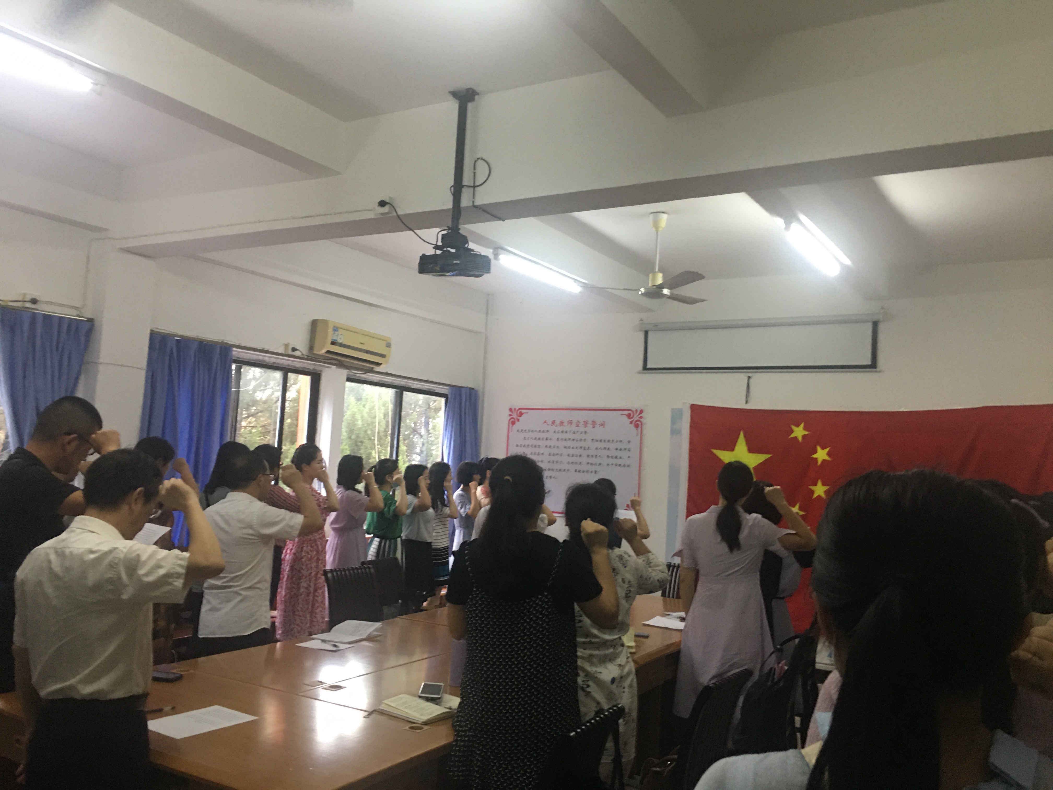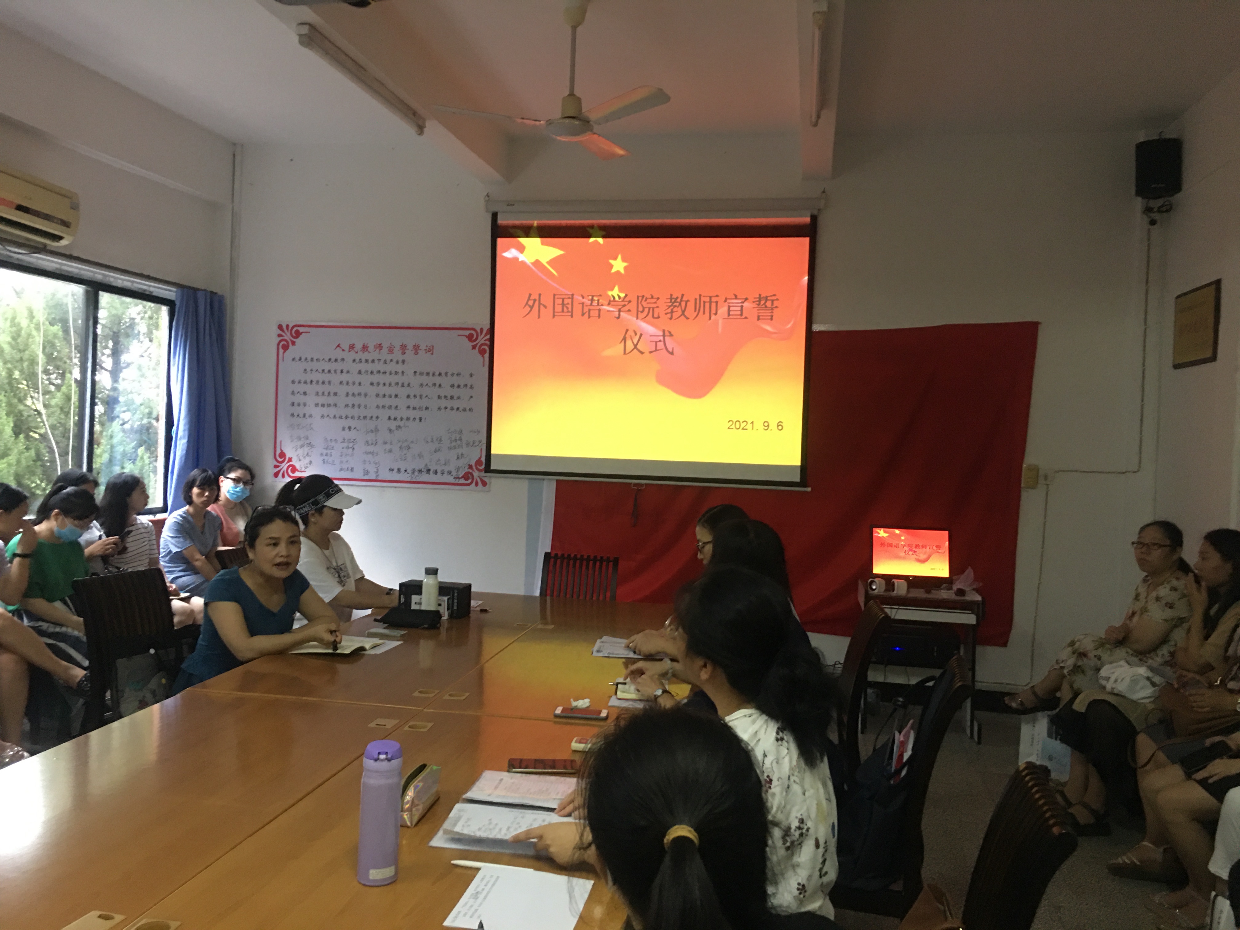 会上,面向国旗,作为领誓人,胡娟院长首先带领全体教师进行人民教师宣誓。“我是光荣的人民教师,我在国旗下庄严宣誓:忠于人民教育事业,履行教师神圣职责,……为人类社会的文明进步,奉献全部力量。宣誓人……”。然后她带领老师们在《人民教师宣誓誓词》签名墙签下自己的名字,强烈的仪式感让大家体会到人民教师的职责所在。接着却正强书记带领院党政领导成员宣誓,向全体教师许下履职诺言。他们表示为了学院和学校的长远发展,会尽心尽责履行职责,争取学院工作在教学和科研上有所突破,衷心欢迎全院师生的建设性献策献计,并诚心诚意接受全院师生的监督。然后,胡娟院长向本学期新进教师表示欢迎,祝愿她们在仰恩大家庭中工作出色,生活出彩。同时她也希望学院安排的结对老师和指导教师能积极向她们提供帮助,使她们尽快熟悉校园、使她们的教学和科研工作尽快步入正轨。