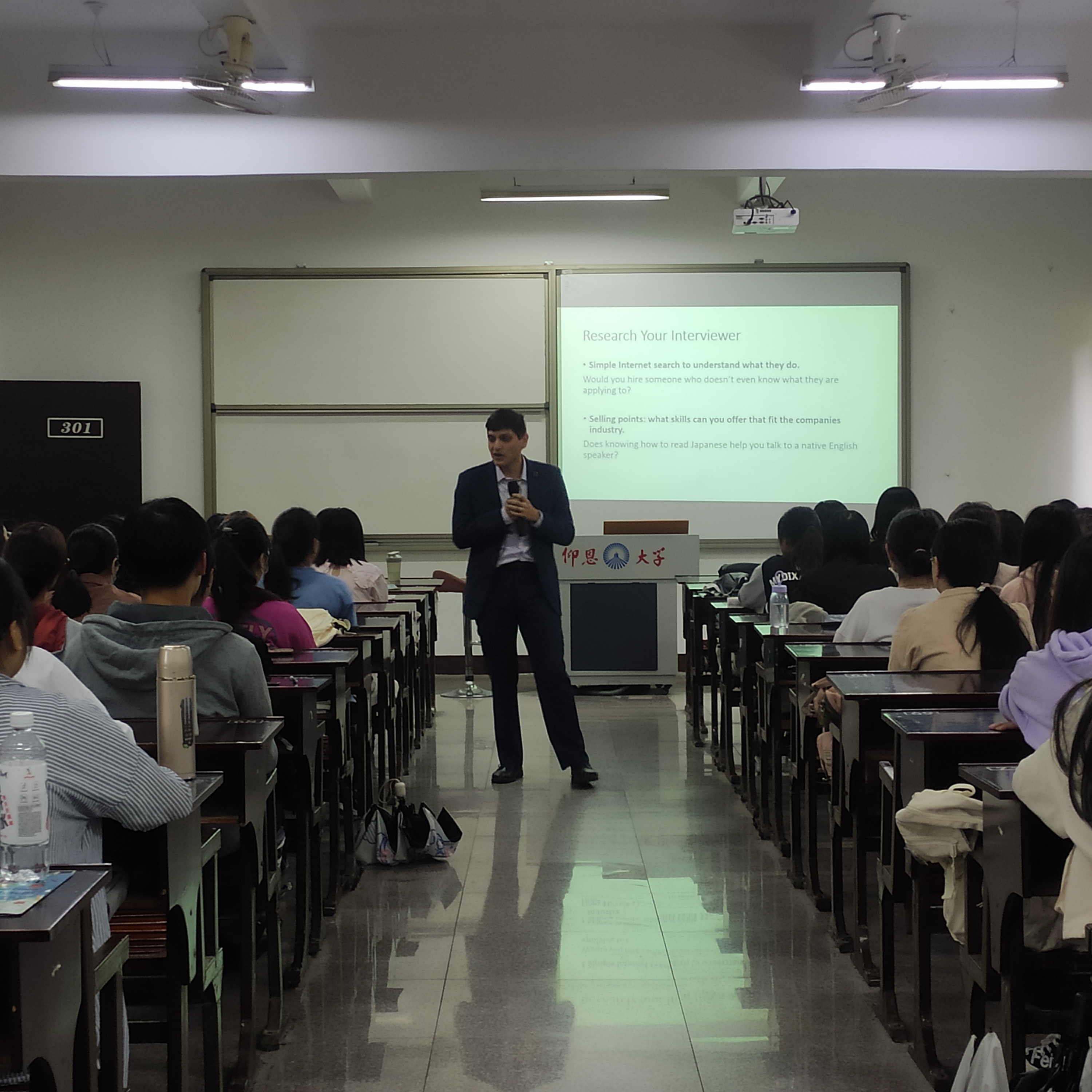 活动由院长胡娟主持。来自明达公司的行业导师Spencer和Andre通过对话引入应聘面试的话题,他们结合自身的经历与经验向大家分享了面试的技巧,例如面试前要做好功课、了解公司情况和工作要求、多与朋友进行面试练习、面试时要与面试官眼神交流、展示自己的优势等。此外,在二位行业导师的指导下,同学们还现场模拟了面试场景,在扮演面试官与应聘者的过程中对面试有了更直观的感受。