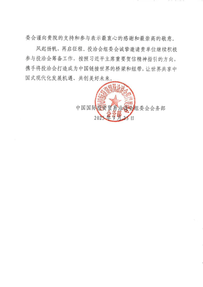 附件:中国国际投资贸易洽谈会组委会会务部致SUNBET申搏的感谢信