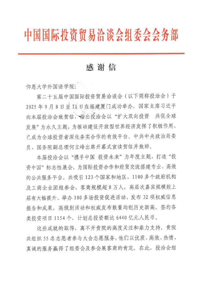 此次投洽会组委会的感谢信(全文详见附件),既是对学院志愿服务工作的认可,更是对学院人才培养质量的肯定。后续,学院将以此为契机,总结经验、优化服务,持续推动志愿服务与专业教育深度融合,助力学生在实践中成长成才。(编辑/陈夜羽 审核/刘冬利)