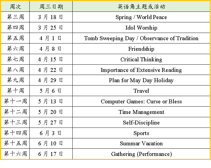 据悉,本学期英语角活动将于第三周正式启动,面向SUNBET申搏2025级学生定期开展。同时,为促进全校英语教学氛围,每周三下午第5–6节,将在新区普照楼205教室和旧区吉龙楼208教室同步开设面向全校的英语角活动,欢迎广大英语学习者踊跃参与,共同在交流中进步,在表达中成长。